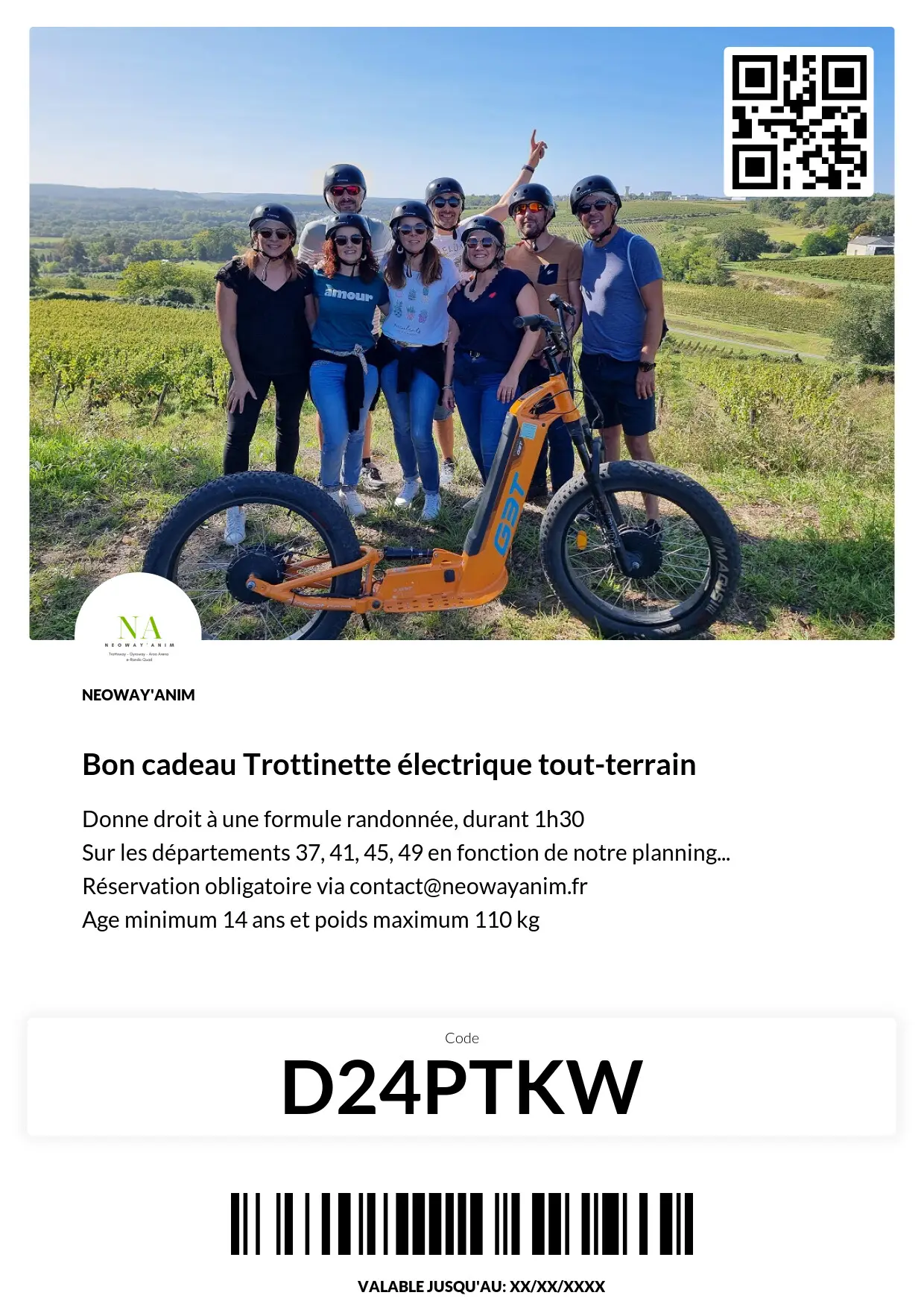 Valable 1 an, l'heureux bénéficiaire n'a plus qu'à nous appeler pour réserver sa balade en trottinette électrique tout-terrain avec sa carte cadeau. Nos trottinettes sont françaises et notre entreprise 100% Val de Loire. Idéal pour un cadeau local et made in Val de Loire !